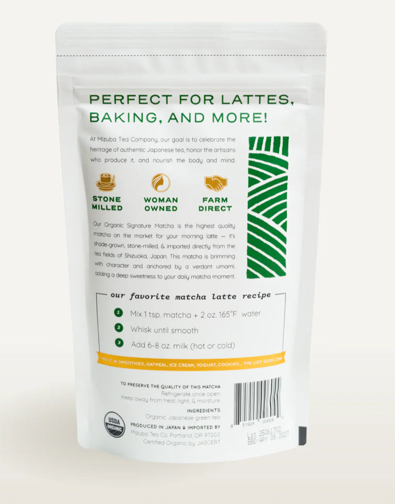 Our matcha is exceptionally fresh: sourced, shade-grown & stone-milled to order from our producer partner's organic farms in Shizuoka, Japan. Our matcha is grown solely with natural, organic fertilizers and no agricultural chemicals or pesticides are used.